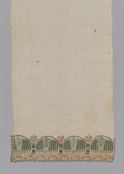This towel, by an anonymous maker, is rendered in linen with embroidered details. In many ways, textiles offer a unique view into the lives of those often excluded from historical narratives. Considered a domestic craft, embroidery was often relegated to the realm of women's work. Yet, such pieces also provided an important medium for creative and personal expression. The whimsical, tented pattern along the hem of this towel suggests a narrative, and invites reflection on the everyday lives and artistic practices of those in the past. Objects such as this towel remind us of the stories that can be woven into the simplest of domestic items, offering insight into the identities, labor, and creativity of those whose names may be lost to history.