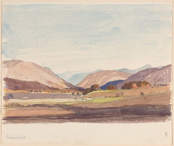 Editor: So this is Gerard Chowne's "Spanish Landscape," and what strikes me is how muted it all is, almost dreamlike. What do you see in this piece, something beyond the surface? Curator: For me, it whispers of memory, doesn't it? Like a half-remembered song. Look at how the colours bleed into each other, the hills dissolving into the sky. Do you think it captures a place, or a feeling of a place? Editor: Hmm, a feeling, definitely. It's romantic, but with a kind of… melancholy. Almost like it's fading away. Curator: Exactly! And isn't that the beauty of it? It's not about perfect representation, it's about capturing the essence of a moment, a place held gently in the palm of your hand before it disappears. Editor: I never thought about it that way. It does feel more meaningful now. Curator: That's art isn't it, a conversation between us, the artist, and the world.