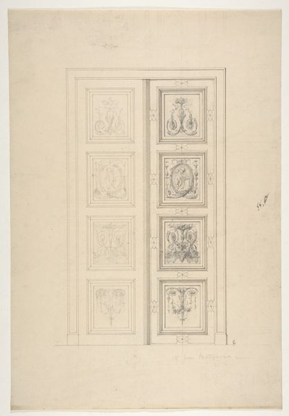 Curator: This is "Carved Wooden Door," an architectural drawing completed around 1936. Editor: Wow, it's just a door, but those details! It’s calling me back to some place both real and imagined; maybe a stage set, all poised and waiting for a grand entrance, or a dramatic exit. I am curious: is this just a drawing, or the rendering of a completed door? Curator: Excellent question. From what we understand, it appears to be a preparatory study—a blueprint, in effect. You can see the detailed measurements scribed to its perimeter and a high degree of detail suggesting it would have been used to commission or fabricate this very ornate set of wooden doors. It shows how critical drawings like these are in the creation and reception of architecture. Editor: So, the real doors might not even exist now, lost in a fire, torn down during renovations or is maybe installed and swinging somewhere adding drama to the entrance of its charmed and sheltered owner! It's funny, isn’t it? The ephemeral and contingent nature of actual structures compared to the permanence that can be achieved through representational practices. That makes this drawing even more powerful; this line on the page exists potentially more permanently than a gigantic cathedral somewhere in Europe! Curator: I think that's a fair assessment. The drawing now functions as both an historical record and also becomes art. Notice how the drawing’s style and meticulous craftsmanship elevate this to a sort of ideal. It presents viewers, even now, with ideas of stability, permanence, even aspiration… a bit grand, don't you think? Editor: Not grand, but full of potential. A door promises you entry to some unknown realm of secrets and adventure or maybe safety and a warm meal. Maybe the carving reminds me that art is an act of opening new possibilities and maybe the idea is more appealing than what’s actually behind any old wooden door. Curator: That’s beautifully put. It highlights the important public role of art beyond pure aesthetics; more like symbolic entry points for dialogue and inquiry, and as markers that give the idea of structure shape in the landscape. Editor: Exactly. So much from what seems at first glance so simple! I wonder, could it maybe swing both ways and what kind of sound it will make when doing so. Curator: Indeed. It does seem to embody both function and potential... Editor: Absolutely. A frozen drawing can unlock very active, deeply intimate parts of our imagination, if you give it half a chance!