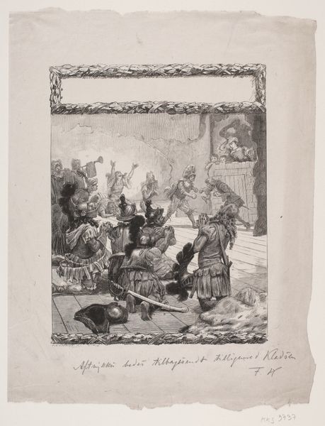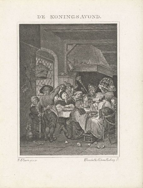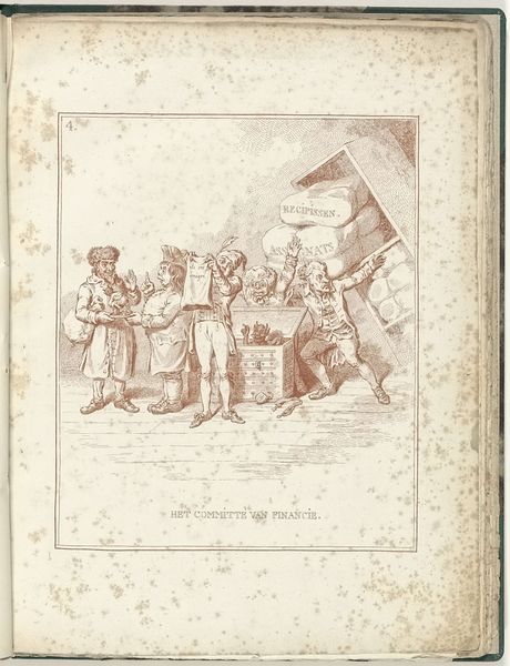 Curator: This is “Comité voor Noodlijdenden, 1795,” or “Committee for the Needy,” a pen, ink, and engraving work by James Gillray. Editor: There’s a frenetic energy in those etched lines, and I must say, it has a rather grotesque air about it. The faces are so distorted, and the figures seem consumed by gluttony. Curator: Gillray was a master of caricature. Look closely at how he manipulates perspective. The table, centrally located, becomes this exaggerated focal point, loaded with foods, drinks, and grotesque faces of supposed members of this ‘committee.’ The symmetry—or lack thereof—plays with notions of order and corruption. Editor: Absolutely. Note, for example, how the bloated faces around that table are juxtaposed with that thin child and how Gillray positions these figures with an awareness of emblematic contrasts. To me, the whole scene reads as a stinging commentary on the hypocrisy of those in power, feasting while the needy suffer. Curator: The details are deliberate, and the expressions are clearly meant to evoke certain symbolic responses from the public. Those grotesque, almost animalistic, features underscore the artist’s critique of the elite. It makes use of distortion, yes, but toward what end? One is asked to consider structure versus emotion. Editor: And isn’t it powerful how Gillray uses the familiar imagery of a ‘committee meeting’ – an established societal structure— to mask a deeper, more cynical truth? I mean, you have symbols of religious imagery twisted into burlesque and social commentary. It's almost like Gillray asks the viewer, 'what is truly sacred?' Curator: Exactly. Ultimately, Gillray compels the audience to decode social issues through the very formal techniques employed in the work: line, composition, space... It’s a potent interplay between structure and content, challenging us to perceive the hidden structures beneath the surface of society. Editor: It's fascinating to see how Gillray could use these symbols and formal strategies to create this sharp, unforgettable statement about compassion and moral failure that clearly, more than two centuries later, we are still wrestling with.