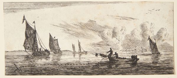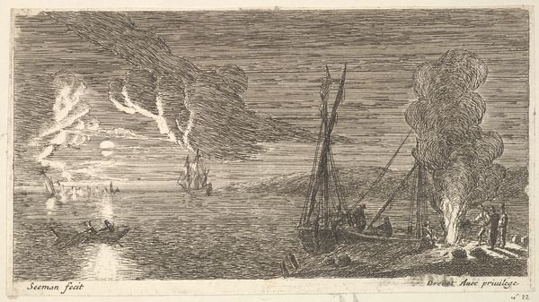 Editor: This is "Two Ships, Keeled for Caulking," an etching by Reinier Nooms, created around 1651. It’s a very busy scene; I am immediately drawn to the chaotic lines depicting the ships and the smoky haze. What are your initial observations? Curator: I notice how Nooms has structured the composition to guide the eye. Note the strategic placement of the keeled ships, serving as anchors within the bustling scene. How does the repetition of vertical lines – masts, pilings, even the strokes representing smoke – affect your reading of the image? Editor: It creates a sense of visual rhythm, almost like musical bars on a staff. But the varying densities of lines also create areas of rest and tension. Curator: Precisely. Consider also the artist's meticulous use of line to define form and texture. Observe how varied hatching techniques model the volume of the ships and create an atmospheric perspective. Does this intricate manipulation of line quality add to your interpretation of the piece? Editor: Absolutely, the hatching gives the scene depth despite being a monochromatic print. I hadn't thought of the line quality creating depth but, it's as if the thinner the line is, the farther away from us it feels. I see it now, especially with the ships in the distance and even in the sky. Curator: It’s in the details. Notice also the interesting light. Even without color, the use of darker line work suggests shadows and light playing across the surfaces of the ships and the water, heightening the visual interest. Does this observation change your understanding of Nooms' intention or achievement here? Editor: Yes, noticing how the lines, though seemingly chaotic, were strategically used makes me appreciate the technique of etching even more. Thank you. Curator: My pleasure. Looking closer at structure certainly unlocks even further layers within artworks.