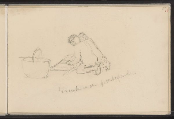 Curator: Oh, this feels like a secret glimpse into someone's notebook. There's a lovely casualness to it. Editor: Indeed. What we're looking at is Cornelis Springer's "Figuren en karren," a drawing made around 1863. It’s held at the Rijksmuseum, and rendered in pencil on paper. It’s so full of impressionistic sketches. Curator: It does! All these quick impressions—carriages, figures...even a little dog! It’s like capturing fleeting moments, which has its own kind of poignancy. Makes me wonder what Springer was thinking that day. Editor: Absolutely. Note the composition. Springer fragments his objects to create a sense of temporality. Observe how some carriages and objects seem more thoroughly realized than others, and contrast that with how others trail into just suggestions on the page. Curator: It's like different levels of memory, isn’t it? The clarity of some forms with the hazy suggestions of others. A day in Amsterdam rendered like half-remembered snippets. I also think that by showing how a dog lazes near the carriages is just perfect for representing everyday life. Editor: Yes, these details, combined with the drawing’s landscape and figuration aspects, firmly place it within genre painting traditions. You feel like you can analyze the people here. Who were these individuals in Springer's life? Are these commissioned pieces, or simply notes that reflect a period? The semiotic potential is immense. Curator: Well, whoever they were, Springer's captured a certain something. The human condition. All our busyness and beauty reduced to a few delicate lines. And isn't it nice that they remain, even like this? Editor: Very true. It’s fascinating to observe how Springer reduces daily experience to lines and shades, building forms and revealing profound truths about the ephemeral nature of living and observing. Curator: The piece left a very light, floating feeling in me. Makes you look up and note your surroundings too. Editor: Precisely, an invitation into how lines themselves can act, point and reflect on existence.