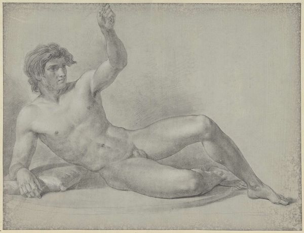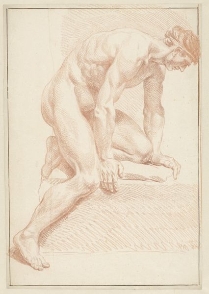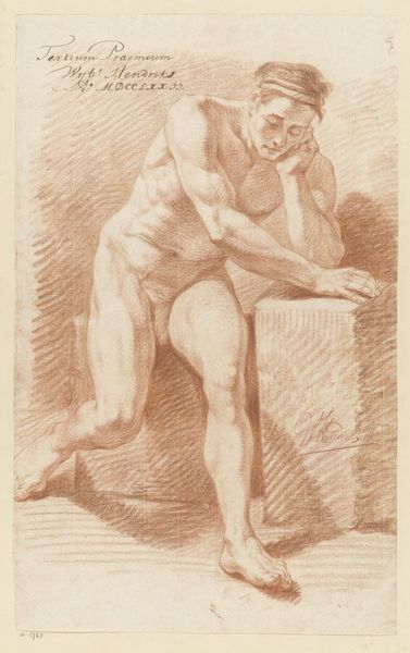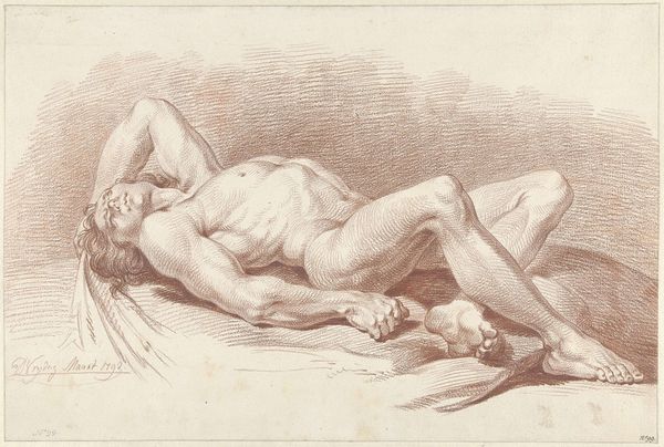 This is a red chalk drawing of a reclining nude male figure, made by Dirk Versteegh in the late 18th century. The man rests upon an unusual, bag-like object expelling air. This curious motif prompts an exploration into the symbolism of wind, breath, and the vital life force it represents across cultures. The figure evokes classical ideals of male beauty, reminiscent of ancient Greek sculptures, while the wind-emitting bag is quite peculiar. This directs our mind back to the classical myth of Aeolus, keeper of the winds. We see this motif echoed through the ages, albeit with alterations, even finding resonance in Renaissance allegories where wind symbolizes inconstancy. Yet here, the figure seems to control it. Consider the breath, the spirit, the very essence of life being physically manipulated. Versteegh presents a psychological landscape, where control over elemental forces reflects inner mastery. The image stirs deep, subconscious recognition, for we all intuitively understand breath's vital link to existence. This is a motif that constantly resurfaces, evolving, gaining new layers of meaning.