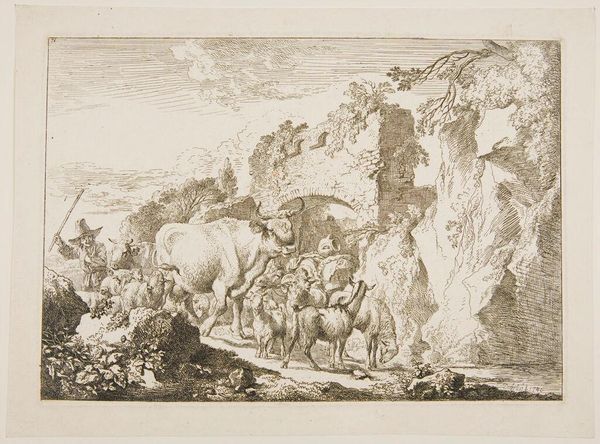 Editor: So, this is Allart van Everdingen's "Watermill at the Foot of a Mountain, an Artist Sketching," an etching. I’m struck by how small it is, yet it captures such a vast landscape. What do you see in this piece? Curator: I see a critical commentary on the artist's role in shaping perceptions of the natural world. Consider the artist sketching, perched above the scene – a position of power. How does this reflect the colonial gaze often imposed on landscapes and their inhabitants? Editor: That's interesting! I hadn't thought about it that way. Curator: Also, who has access to these idealized landscapes? And at what cost? Does the picturesque obscure the realities of labor and resource extraction inherent in the scene? Editor: It really makes you think about the hidden stories within seemingly peaceful landscapes. Thanks! Curator: Absolutely. It's about questioning whose narratives are privileged and whose are erased.