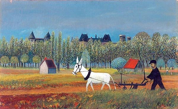 Editor: This is Henri Rousseau’s "Park with Figures," painted in 1895 using oil paint. I’m struck by the composition. It feels very dreamlike. What do you see in this piece? Curator: This dreamlike quality is key. Rousseau often depicted imagined worlds, blurring lines between reality and fantasy. I see a commentary on the intrusion of industry into the idyllic landscape. Notice the smokestack juxtaposed with the pastoral setting and the figures formally attired, observing it all. What might these tensions signify in late 19th-century France? Editor: I suppose that the smokestack does juxtapose with the landscape. Are you suggesting the artist might be demonstrating his feelings toward the environment and the coming industrial revolution? Curator: Precisely. Rousseau wasn't formally trained, and some critics dismissed his work. But there's power in his naive style. The rigid figures, the flattened perspective – they heighten the surreal, almost unsettling atmosphere. It is easy to believe that the subjects in the park feel similarly unsettling as new technological advances come to the city. Editor: That’s interesting; it does have a certain tension that is easily missed if one just sees the art at face value. This helps me to appreciate the thought behind Rousseau's seemingly simple compositions. Curator: Exactly! And it reminds us to question what appears harmonious. By investigating the disruptions of industrialization, class, and even artistic conventions, Rousseau prompts us to re-evaluate our relationship with the world around us. Editor: This was truly eye-opening! Curator: Indeed! Art provides a lens for scrutinizing prevailing norms and biases.