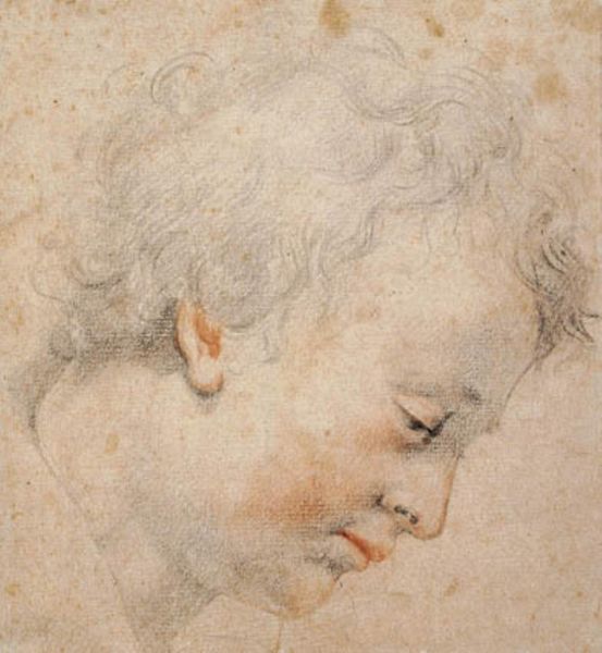 Pompeo Batoni sketched this "Bust-Length Study of a Child" with graphite, capturing the tender innocence of youth. Note the child's downward gaze and the soft, rounded forms that define the face— these recall the visual language used for depictions of Cupid or even the Christ Child in Renaissance art. This echoes motifs found in earlier works. Think of the pensive, downcast eyes that convey a sense of vulnerability and introspection. This gesture can be found as far back as ancient Roman sarcophagi, signifying mourning or contemplation. Consider how the child's delicate features and gentle expression tap into a collective memory of idealised youth. This image resonates on a subconscious level, evoking feelings of nostalgia and the fleeting nature of innocence. Observe how Batoni’s study captures a timeless quality through the iconography of childhood, continuously resurfacing in different forms. This underscores how the emotional power of such imagery persists through the ages.