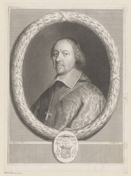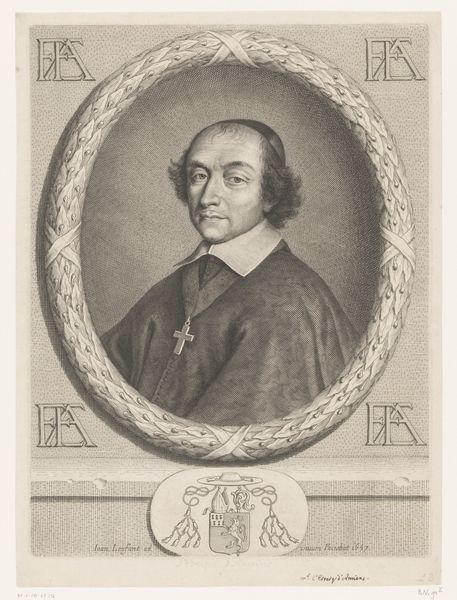 Pierre Landry created this print of François Faure, likely in France during the late 17th century. It presents us with more than just an image of a man; it offers a glimpse into the rigid social structures of the time. The visual codes in this portrait speak volumes about Faure's status as a bishop. We see signifiers of power and religious authority: his clothing, the cross, and the inscription of his title, framing him in the oval. Landry’s work reflects the cultural and institutional power of the Catholic Church in France. The portraits were commissioned and widely circulated to reinforce social hierarchies. Understanding this artwork requires us to delve into the history of the church and its relationship with the state, the role of religious figures in governance, and the dynamics of class and power. As historians, we use resources such as church records, political documents, and other visual materials to better understand the social context that shaped not only the subject but also the creation and reception of this image.