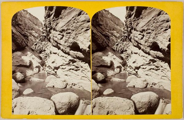 Curator: This stereograph, titled "Water Pocket in a Glen" by J. Fennimore, presents us with an intriguing landscape, a miniature world captured in sepia tones. Editor: Oh, it's like stepping into a dream! That gentle light, the still water – it whispers of forgotten places and hushed secrets. Curator: Indeed. The water pocket itself becomes a mirror, reflecting both the physical world and, perhaps, our own inner landscapes. Water carries multiple meanings, from cleansing and rebirth to the unconscious mind. Editor: I see it! The way the image is split, doubled, it feels like we're being offered two perspectives on the same feeling, the same memory. It's cleverly constructed, a real atmospheric piece. Curator: Yes, the doubling enhances that sense of immersion, drawing us into this hidden glen. It reminds us that perspective shapes our realities. Editor: It makes me want to write a poem, or maybe just sit there and breathe it all in, that sense of quiet mystery and stillness.