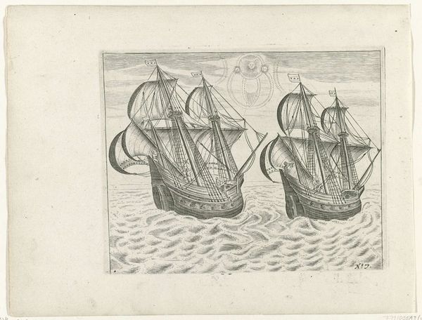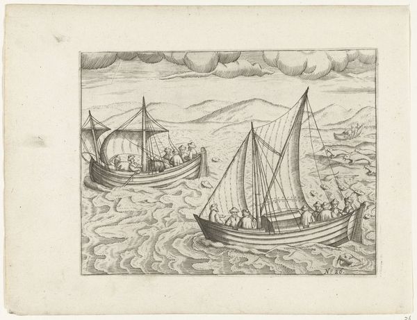 Editor: Here we have "De ontmoeting met een Russische lodja, 1597", created between 1615 and 1617 by an anonymous artist. It's currently housed in the Rijksmuseum. This ink drawing possesses a captivating old engraving style, with figures huddled on a boat battling what appears to be very choppy seas. What statements does it make, or questions does it pose about the relationship between cultures during this period? Curator: Well, seeing this, I immediately think about the loaded history of encounters. What does "meeting" or "encounter" really signify in the context of 16th-century European expansion? I think it is important to consider this artwork as participating in the rhetoric of exploration and perhaps even a subtle glorification of power dynamics that often overshadow the human cost. How do you think the depiction of the figures contributes to this narrative? Editor: It's interesting that you highlight the figures – their depiction appears almost incidental. Does their placement and representation then downplay any sense of individuality or potential conflict during these "encounters?" Curator: Precisely. This stylistic choice has socio-political implications. It could normalize the dominance of one culture over another, making any potential exploitation or displacement less visible. The turbulent seas perhaps offer a metaphor, yet it is essential to ask who controls the narrative about navigating such challenges, and whose stories remain untold. What do you make of the religious undertones? Editor: I hadn’t considered religious interpretations. So it prompts the questions of whose religious views were centered and whose were suppressed during encounters and exchanges. It encourages looking beyond face value. Thanks! Curator: Exactly! And by looking at the piece in this light, we can explore whose perspectives might be missing and consider the complex realities of these historical interactions.