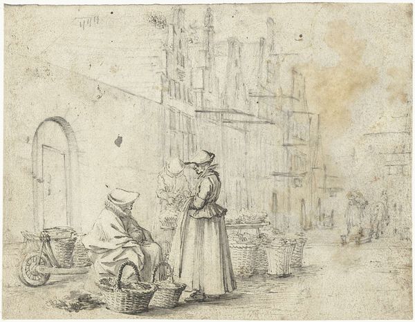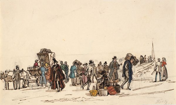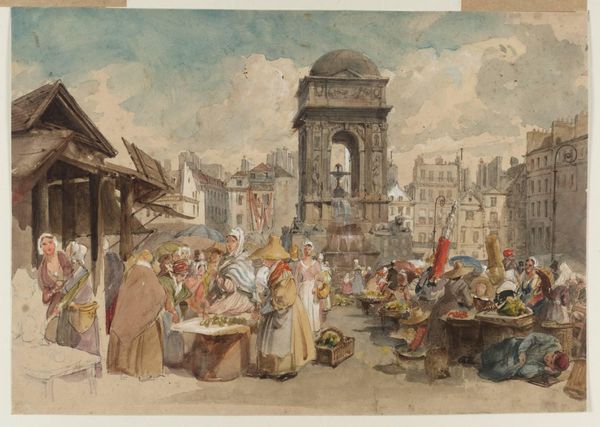Curator: What a captivating slice of life! This is Thomas Rowlandson's "St. Cullum's, Cornwall." It's undated but rendered with ink and watercolor on paper, giving it a vibrant yet delicate quality. Editor: My initial impression is that of a stage setting. The light is so even, almost theatrical, casting this charming English village scene in a perpetual midday glow. Curator: Rowlandson certainly had a flair for the dramatic! The church, depicted with simple, clear lines, dominates the composition, but then your eye is immediately drawn to the everyday activity swirling around the town square. Editor: I find the way the figures huddle together particularly intriguing. There's a real sense of community and congregation around both the symbolic—represented by the old stone pillar at the right—and the commercial at the center. Note that this sense of public sphere, here captured for a moment in ink and wash, becomes something to yearn for later, a cultural memory in the face of urbanization. Curator: You’ve picked up on a potent aspect there! Notice the horses too. For many viewers in Rowlandson's time, and for those centuries before, animals were of crucial importance. Here, the horses add to the painting’s visual energy as well as indicate patterns of travel, trade, and social connection. Editor: It makes me think about how Rowlandson perceived—and then presented—the rapidly changing landscape of England during his time. The almost cartoonish element in how he renders each individual gives us distance and perhaps offers a critical view of society? Curator: Precisely! We shouldn't shy away from considering the satirical bent Rowlandson brought to many of his works. What might read to us now as simple observation, to his contemporaries may have telegraphed social commentary about class, labor, and the roles that rituals—both civic and religious—play in shaping identity. Editor: Seeing all this laid out with such deft strokes also gives you an odd feeling for what this all might sound like! I can almost hear the din of the marketplace and the gossiping from the well. Curator: And smell the animals and the produce! Rowlandson truly brings the senses alive, creating an image that resonates far beyond just visual appeal. Editor: Ultimately, this humble watercolor presents a time capsule; not just an image but an experiential portrait of community. Curator: Yes, indeed. Rowlandson offers us a vibrant and intimate snapshot of English life at a turning point. A rich tableau worthy of deeper examination.