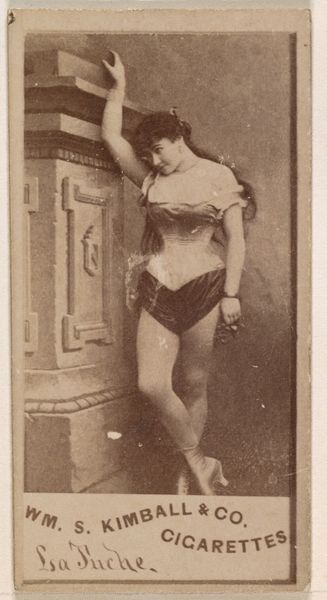 Editor: This is "Emma Cameron, from the Actors and Actresses series," a cigarette card dating from between 1885 and 1891, created by Allen & Ginter. It's a photographic print, and there's something quite striking about its pose and presentation for what's essentially an advertisement. What symbols jump out to you in this image? Curator: The overt theatricality is a major symbol here. It's a performance of identity, meant to entice. But let’s consider Emma Cameron herself, her name boldly emblazoned—a signal of recognition. In the Victorian era, actresses were often both celebrated and scrutinized. The cigarette, nonchalantly held, speaks to emerging freedoms and a shifting social landscape where women, like Cameron, sought agency, projecting the aura of "the New Woman." Doesn’t the riding crop further enhance this sense of confident authority? Editor: It does, now that you mention it. There’s almost a sense of dominance conveyed by her posture and the riding crop, countered perhaps by the ornate yet confining backdrop. Curator: Exactly. The backdrop, mimicking classical statuary, serves as a cultural anchor, yet the contrast is telling. Cameron is presented as both a modern woman and a figure alluding to established, classical ideals of beauty. Can we see the commercial product here, the cigarette, also embodying the same tensions: indulgence and sophistication intertwined? Editor: That makes a lot of sense. The cigarette isn't just a product, but a symbol of aspiration. Curator: Precisely. These small cards acted as accessible portals into a world of fame, beauty, and luxury, condensed and disseminated for mass consumption. This intersection of art, commerce, and cultural aspirations makes it a potent and fascinating artifact, wouldn't you agree? Editor: Absolutely. It’s given me a whole new perspective on what these little cards represented at the time. Thanks for your insights.