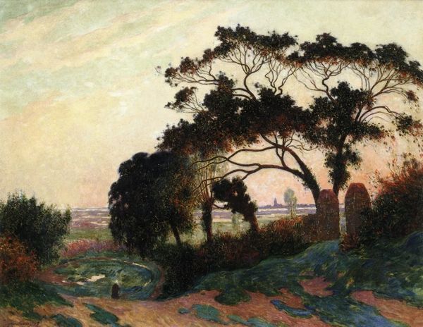 Konstantinos Maleas created this landscape painting, featuring a tree and mosque, using oil paint. Maleas, a Greek post-impressionist, painted this landscape during a period of intense nationalism and cultural re-evaluation in Greece. The painting invites us to consider the intersection of nature, culture, and religion. Dominating the foreground, the tree stands as a symbol of rootedness and natural beauty. It juxtaposes the mosque in the background, representing the historical layers and diverse cultural influences within the Greek landscape. This combination reflects the complex relationship between Greece's classical heritage and its Ottoman past, a theme Maleas often explored. How does this landscape, with its blend of natural and cultural elements, speak to the ongoing dialogue between identity, history, and place? What emotions does this evoke in you?
