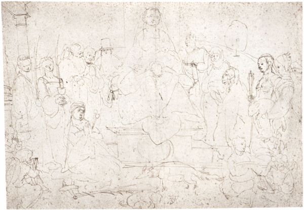 Editor: This drawing, titled "Studienblatt. Eine Vielzahl von Personen bei alltäglichen Verrichtungen", is attributed to Jan van de Velde II and is currently held at the Städel Museum. It appears to be made with ink on paper, possibly a study sheet. What strikes me is the overall arrangement – a multitude of figures scattered across the page. What do you see in this piece? Curator: Indeed. The intrinsic value lies in the artist's control over line and form. Observe how each figure, despite the minimal detail, is rendered with a clear sense of volume and posture. The economy of line is remarkable. Do you notice how the artist uses varied line weights to suggest depth and differentiate foreground from background, even within this relatively flat plane? Editor: Yes, I see it now. Some lines are much bolder, defining outlines, while others are incredibly thin, almost like shadows, suggesting contours within the forms. Curator: Precisely. It is through this masterful manipulation of the graphic elements, line, form, and the distribution of marks across the paper, that van de Velde constructs not only individual figures, but also the dynamic interplay between them, guiding the eye across the composition. This demonstrates a sophisticated understanding of visual structure. Editor: So, by focusing on the line, shape and how they’re organised on the paper we can learn more about how an artist thinks? I assumed that it was necessary to know more about their lives in order to analyse this drawing further. Curator: One could. However, an artist's understanding and ability to wield form is equally revealing of intention. How form impacts your seeing and knowing becomes information. Editor: I hadn't considered approaching it that way. That gives me a fresh way of thinking about drawings. Curator: Understanding visual language opens further doors of perception. The potential for discovery expands.