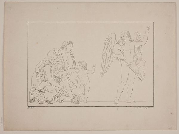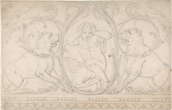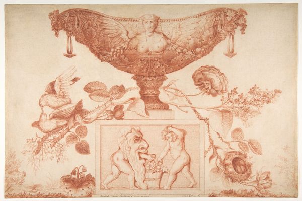 Curator: Look at this delicate thing! “Ornament Containing Kneeling Boy and Turkey,” an anonymous piece from somewhere around 1775 to 1825, residing here with us at the Met. Isn’t it charming? Editor: It is... peculiar. A sort of high-low marriage of cherubic decoration and, well, poultry. Immediately, I'm interested in what it might have ornamented and who its commissioner might have been. Curator: Exactly! You can almost see the artisan’s hand at work, sketching, considering the purpose it’s intended to fill. Probably an etching or a print, judging from the style and the timeframe, maybe even a preliminary design. You can see the pencil lines so clearly... Editor: I'm struck by the presumed means of reproduction. It's all lines –etching probably. You see the work of labor and reproduction: What does it mean to put something of everyday, rural labor next to that idealized little cupid figure? Curator: A cheeky juxtaposition, maybe? A feathered friend for our classical pal? The turkey seems almost...regal here, in its own odd way, mirroring the cherub's contemplative mood. What I'm wondering about, and I suspect is lost to us now, is whether these sketches are meant to convey some narrative. Or are we simply supposed to admire these little islands, complete in themselves, contained by their frames and borders? Editor: It's interesting to see a rejection of the grand, sweeping narrative, isn't it? Instead, you get this... fragment. I fixate, too, on the production aspects. Was the artist part of the "grand narrative" world, or closer to craft practices? What kind of "labor" were they engaged in? Curator: Perhaps they straddled both worlds, then. And really, isn't that what gives the image its spark, that frisson of two worlds, both elevated and grounded? Editor: Yes! Exactly, and maybe there’s an attempt here to erase or obscure that difference between fine art and functional ornamentation? Or maybe just play with the class-based expectations associated with both of them. Food for thought indeed... or is that fowl for thought, here? Curator: Oh, I like that! Well, on that appetizing note, shall we move on? I know the Medieval Tapestries are calling your name.
