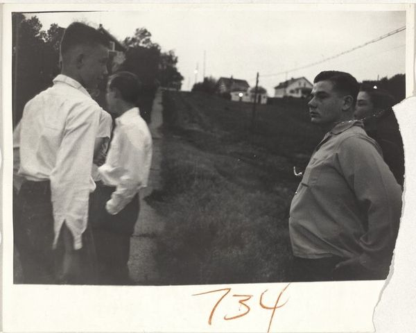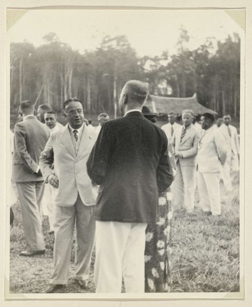This photograph, titled "Genodigden met elkaar in gesprek", was made at an unknown date by an anonymous artist with a camera and film. What I find striking is how the gradations of tone produce a sense of space, pulling you into the scene. The texture is smooth, almost velvety, a testament to the photographer’s control over the medium. The interplay of light and shadow across the figures creates a dynamic tension. Look at the way the light catches the bald head in the middle; the stark contrast adds a sense of drama. It reminds me of a Rembrandt, but with a stark, modernist sensibility. The ambiguity of the photograph is its strength; the identity of the sitters, their conversation, and the location are all left to our imagination. You know, this reminds me a little of Lisette Model's work, she also liked to capture candid moments and let the viewer fill in the gaps. Art is this ongoing dialogue, isn't it?