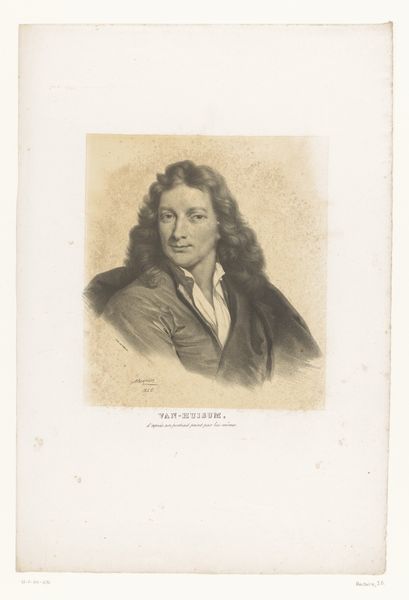 Editor: Here we have Nicolas Maurin's "Portret van Bartholomeus van der Helst," a drawing that was printed as an engraving, dating roughly from 1826 to 1852. The contrast between the lace and the sitter's face really pulls me in. What elements stand out to you in this piece? Curator: The lithographic and engraving techniques allow for a striking play of light and shadow, emphasizing the textures within the image. Consider how the meticulous hatching defines the contours of the face and the folds of the clothing. Note also the delicate rendering of the lace collar – the density of lines creates an almost palpable sense of texture against the smoother areas of the face and hair. It exemplifies how artists manipulated the limitations of reproductive print media to simulate painterly effects, and that is central to this piece’s structure. Editor: So you are focusing on the techniques that imitate painting within a print. But isn't the success of a portrait also reliant on capturing a likeness? Curator: Likeness, representation; these are indeed qualities that resonate on some levels. But observe how the linear qualities create rhythm through the composition and unify various textures within the form. What could be described as mere resemblance actually emerges from the artist’s adept manipulation of the medium's inherent characteristics. Semiotically speaking, the codes within the portrait function foremost to explore possibilities latent within the printmaking form itself. Editor: So, you're suggesting the print isn't just trying to look like a painting; it's using those elements to create something entirely new based on what engraving and lithography are able to achieve on their own terms? Curator: Precisely. Through acute formal arrangement, Maurin transcends simple replication and manifests unique expression through structural relationships born of material possibility. Editor: I see it now; it is less about what is represented and more about how those realistic qualities are achieved with this print style, and what that emphasis communicates. Thanks for expanding my perspective!