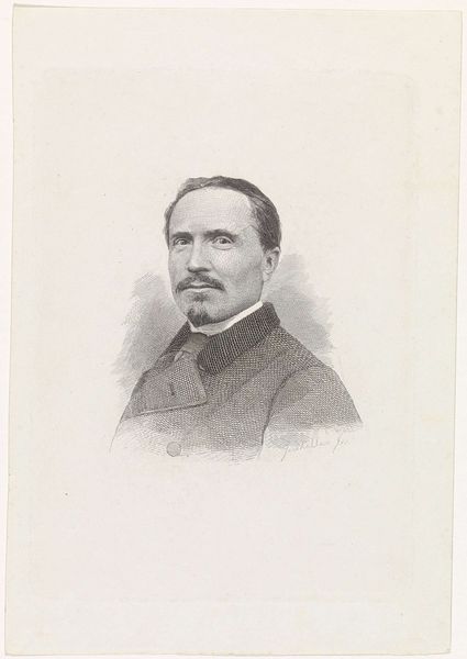 Curator: Let's consider this intriguing portrait rendered in pencil by Joseph Edouard Van Looy, sometime between 1881 and 1912. It is a likeness of Françoise L'Hoëst. Editor: My initial impression is one of reserve. The palette is muted, of course, being pencil on paper. But beyond that, there’s a stillness to the man, a formality. His mustache is impressive, almost like a mask. Curator: Masks and identity... precisely. Look at how the artist meticulously renders Françoise's features. But also consider how the portrait is placed. Note the date it was created, think about societal roles then, and tell me what power dynamics are visualized. How is masculinity presented here? Editor: He wears a dark jacket and light shirt with a dark, barely visible, tie. That look signifies middle-class respectability to me. The pin on his lapel indicates an affiliation. But the gaze… that’s what holds me. Curator: What do you find in his gaze? Editor: There is intensity but not arrogance. Maybe quiet determination, like the steady gaze we sometimes see in depictions of saints. The rendering of the light across his brow signifies thoughtfulness. I see intelligence, and even melancholy. Curator: It’s interesting that you interpret a certain melancholy in the rendering. Is this a comment on societal conditions as they existed during the late 19th and early 20th centuries? In what context should we place Françoise? And to what cultural archetypes does he conform or diverge from? Editor: You bring up an important question. Is Van Looy portraying Françoise, or a representation of patriarchy? Perhaps there's even an intentional echo of iconic, paternal figures – an almost stern father-image presented in a soft drawing style. Curator: It certainly invites broader reflection. This work allows for critical examination of societal structures embedded within portraiture and offers viewers a point of entry into thinking critically about identity and representation. Editor: Absolutely. Considering the potential layers of cultural memory contained within, it adds another dimension to this intriguing drawing.