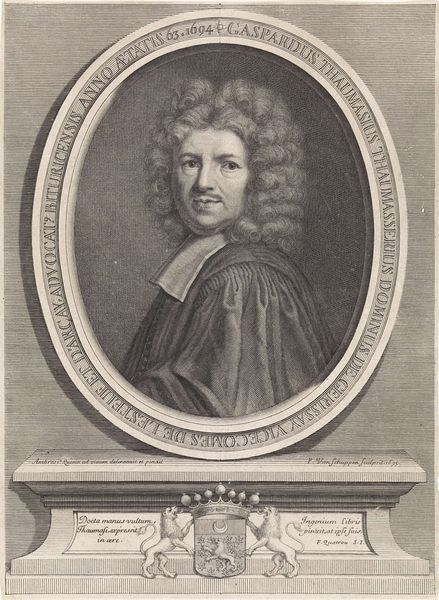 Editor: So, this is a portrait of Petrus Suerendonck, an engraving dating from 1664 to 1721. It's located at the Rijksmuseum. It has such a formal air about it; a sense of importance and the subject’s face radiates with intelligence and purpose. What strikes you most about this piece? Curator: Well, beyond the formal representation typical of the era, I’m drawn to the symbolic elements at play. Look at the laurel wreath surrounding Suerendonck. Laurels traditionally signify victory and honor. Given that Suerendonck was a Rector, what kind of victory do you think this signifies? Editor: Maybe an academic or intellectual victory, rather than a military one? Curator: Precisely. Now, notice the text below the portrait. Inscriptions are often there to do more than label a name; they frequently imbue the sitter with certain virtues, establishing his legacy for posterity. It is like imprinting this memory and perpetuating it. How do you think the symbolic implications of this particular image work to define cultural memory surrounding scholarship and leadership? Editor: It almost sets a standard, doesn’t it? A reminder of the qualities valued in a leader of that time – learning, dignity, respect... Curator: Exactly! And portraits such as this served as both commemoration and aspiration. They solidified societal ideals. Consider the fashion - the elaborate wig and formal attire; how might that reinforce cultural ideals about status and intellectual pursuit? Editor: The wig suggests wealth and education. It helps construct this whole image of scholarly prestige. Curator: Right. Everything is deliberate, creating a multi-layered symbol ripe with cultural meaning. Editor: I never thought about a portrait holding so many layers of meaning beyond just a likeness. I see so much more than I did before! Curator: Understanding these layers reveals not only the individual but also the values their society wished to uphold and remember.