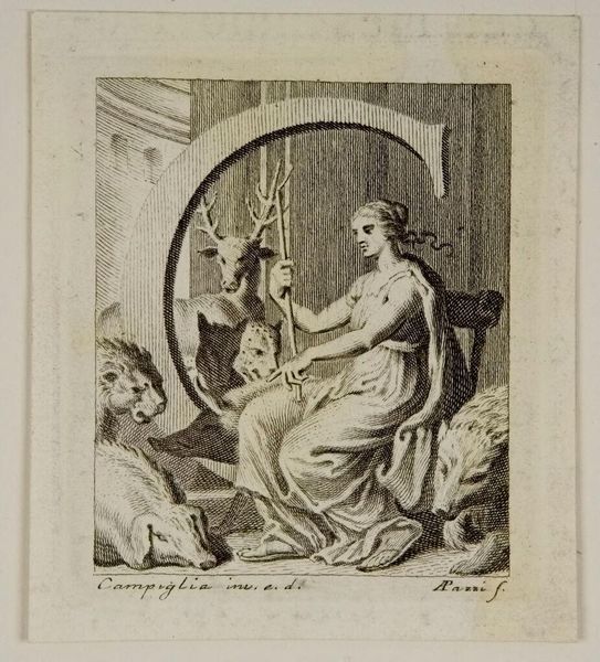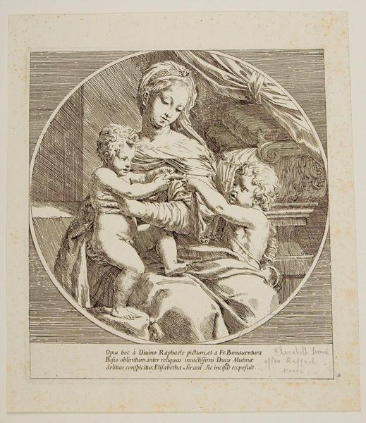 Curator: This is Johann Gotthold Seiffert's "Young Girl with a Cat", a delicate engraving, here at the Harvard Art Museums. The oval composition is quite striking. Editor: It feels melancholic, wouldn't you say? The tones are muted and I’m immediately drawn to the texture of the paper. The etching work must have been painstakingly slow. Curator: Indeed, the tonal range is limited, yet look at how Seiffert achieves depth. Consider the contrast between the tightly hatched background and the smoother rendering of the girl's face. The form is articulated with great skill. Editor: I can't help but wonder about the printing process, the labor of the engraver and the paper’s journey. The inscription at the bottom dedicating it to a Count speaks to the social context of its creation. Curator: A crucial observation. The dedication underscores the work's function as a gift, a token, or even a diplomatic gesture, imbuing it with an additional layer of meaning. Editor: Right. It's tempting to imagine the workshop, the materials… How does the paper shape our experience of the image itself? Curator: An interesting way to consider the work. For me, the power resides in the interplay of light and shadow, the compositional balance between the girl and the cat. Editor: And I am reminded of all the unseen labor that allowed that balance to come into being.