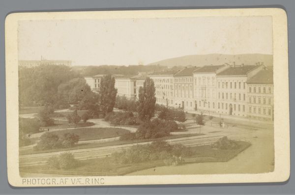 Editor: Axel Lindahl’s gelatin silver print, *Gezicht op de Kungsträdgården in Stockholm*, dating back to the 1890s, presents this city park as a haven of tranquil escape. Its monochrome tones almost make it feel like stepping back into another world, quiet, elegant and frozen in time. What do you see in this piece, from a more…lived-in perspective? Curator: Well, you know, looking at it now, it feels less like a captured moment and more like a dream. Lindahl's pictorialist style truly softens reality; he presents not Stockholm, but an *idea* of Stockholm, which is so interesting, isn't it? He pulls on atmosphere and suggestion instead of stark realism. This park, already manicured, he manicures further, doesn’t he? What's most striking to me is how the architecture sits back almost embarrassed behind the greenery. Almost bashful to make a statement. I find myself thinking – what's that contrast *telling* me? Editor: Embarrassed architecture! I like that. The relationship between the built environment and nature seems so different then; there is a push and pull that continues even now. What do you think the trees stand for? Protection? Privacy? Curator: Possibly both? The era’s sentiment favored romantic naturalism – viewing nature as a sanctuary, maybe a stage for the human drama, perhaps an idyllic contrast to the quickly industrializing cities. But tell me, looking at it with fresh eyes, does this image spark a sense of belonging? Or something else entirely? Editor: It evokes a curiosity. To understand the world that framed this photo – the bustle behind that perceived tranquility. It is as though you see a place you would visit, but also seek something more authentic. Curator: That’s beautiful, that search. Lindahl gave us a whisper; you found its echo. It’s amazing how images carry those traces of moments lived and not lived; a keyhole to peer through, isn't it? Editor: It absolutely is; there's something timeless and revealing about this picture.