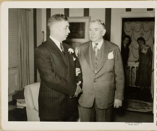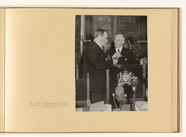 Curator: Here we have an untitled photograph by Jack Gould, currently held in the Harvard Art Museums, depicting a man placing a pin onto another man's jacket. Editor: There's something very formal and slightly unsettling about this image, even though it seems to document a moment of honor. Curator: The placement of a pin can represent recognition, but also conformity, depending on the socio-political context. The uniformity of dress and the American flag backdrop are potent symbols. Editor: Precisely. The pin itself, an emblem, signifies belonging and adherence to a system. It’s a visual shorthand for values accepted and allegiance pledged. Curator: It begs the question: what are the power dynamics at play? Is this a genuine honor, or a symbolic imposition? Editor: Perhaps it's both. Symbols always carry multiple layers. This image captures the tension between individual identity and collective expectation. Curator: A fascinating study in the quiet yet powerful language of symbolism within social structures. Editor: Indeed, a small gesture loaded with historical and cultural significance.