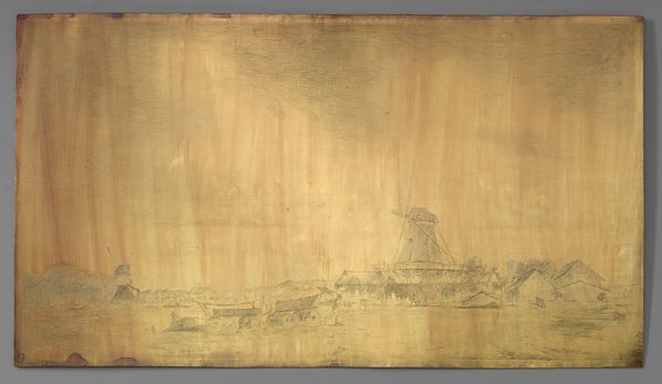 Curator: I find myself drawn to this enigmatic sketch, "Mestvaalten bij avond," or "Dung heaps in the evening," crafted around 1890 by Floris Verster. It's a pen and ink drawing, yet the underlying reddish tone hints at coloured pencil beneath the main sketch. Editor: There’s a haunting quality to this piece. The harsh, rapid lines seem to trap a very still, almost desolate atmosphere, even within the implied cityscape. It reminds me of some post-industrial ruin laid out during some unknown sunset. Curator: The scene undeniably possesses a certain weight, wouldn't you say? While depicting something as mundane as dung heaps, the deliberate artistry lends it an enduring quality, speaking perhaps to a sense of Dutch industry but tinged by the changing realities that accompany such progress. It becomes a document not only of place, but a portrait of transition, imbued into that specific symbol. Editor: I see that. From a purely structural viewpoint, though, observe the dramatic contrast created between the frenetic scribbles of the heaps versus the relatively tranquil horizontality suggested for the waterway or the sky, broken with those subtle atmospheric marks. It really anchors the subject, giving form and stability, however fleeting. The color gradients too seem intended to suggest time's passage. Curator: You’ve captured something crucial about the passing of time within a traditionally ordinary motif, so it becomes extraordinary and evocative. As if Verster recognized even back then that seemingly commonplace aspects can encapsulate powerful commentary and the slow changes that influence communal history. He asks us what symbols mean through these rapid impressions that carry such meaning across ages. Editor: Ultimately, it’s a study in stark juxtapositions – frantic line work alongside subdued, atmospheric colouring that seems to lend a great feeling of temporal depth. This strange pairing produces a haunting image. Curator: Yes, an unlikely scene depicted by equally unlikely artistry and style; and because of that dichotomy, we are challenged to interpret all the symbols presented through technique and topic across a canvas only a simple moment to record in history. Editor: And through the contrast it resonates so strongly in the heart.