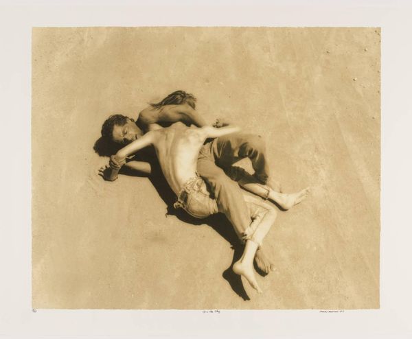 Editor: This untitled image by Tracey Moffatt shows two figures intertwined on a seemingly barren ground. The sepia tone evokes a sense of desolation. How do you interpret this work within a broader social context? Curator: Moffatt's work often explores themes of race, sexuality, and colonialism in Australia. The figures' entanglement suggests a complex power dynamic. Is this a struggle, an embrace, or something in between? Consider how historical depictions of Indigenous Australians have often been staged or manipulated. Editor: That's insightful. The ambiguity makes me question the narrative. Curator: Exactly! Moffatt challenges us to deconstruct our assumptions and recognize the constructed nature of identity and representation. How does this resonate with you? Editor: It makes me rethink the stories we tell ourselves about history. Curator: Precisely. And that’s the power of art like this – it forces us to confront uncomfortable truths and engage in critical dialogue.