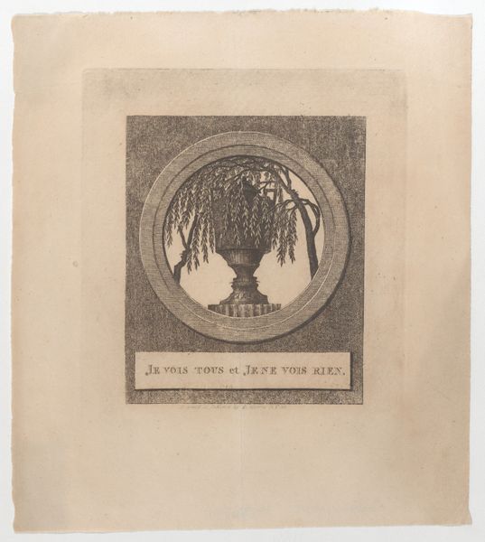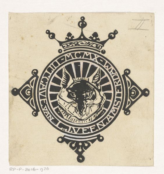 Curator: Here we have a bookplate, or "Ex Libris," created in 1909 by Carel Adolph Lion Cachet. It was made for the Johannes Henoch Neethling collection, which resided at Victoria College in Stellenbosch. The medium is woodcut. Editor: Oh, it's immediately striking. The dark ink gives it such a weighty feel, doesn’t it? Almost medieval, yet with a clear art nouveau twist. I love how contained, almost secret, the central imagery seems within that bold border. Curator: It’s quite characteristic of Cachet, who blended symbolism with decorative art. Notice the lettering, the stylized flowers, even the geometric motifs around the perimeter—each element is carefully chosen. Bookplates traditionally signify ownership, but here, it elevates the idea to something more like a personal crest, hinting at the collector’s identity. Editor: Right, it's more than just a stamp; it's an assertion of taste, a tiny, carefully considered statement. It really makes me think about the hidden stories books hold. Do you think Neethling specifically commissioned it, to signify his passion? Curator: Undoubtedly. The stylized tulips, for instance, a popular motif of the Art Nouveau era, could symbolize affection and remembrance. The placement of “Uit de Boekerij”, which translates to "From the Library," acts as a bridge, connecting Neethling's identity to the essence of the collection itself. We tend to skim over such details but they speak volumes about that era’s visual culture and aspiration. Editor: Absolutely. In our image-saturated culture now, these handcrafted emblems feel like precious, intimate artifacts. Imagine carefully affixing this to the front of each prized volume. It also makes you ponder the weight of such collecting! How was this selection of literary work an integral reflection of identity? It seems less functional and more of a testament, doesn’t it? Curator: Precisely! And even the visual elements can carry different nuances across time; what felt daring and modern back then is seen differently. As with all symbolic languages, these impressions morph in new times and cultures. Editor: So true. Looking at this tiny portal, it speaks of history, artistry, and the pure joy of building a personal library. It definitely makes me want to go and bury myself in some dusty old volumes myself! Curator: Indeed, a small, beautifully considered emblem that offers insight far beyond its dimensions.