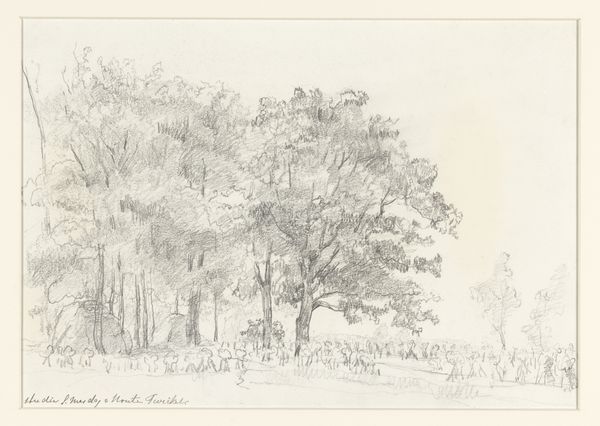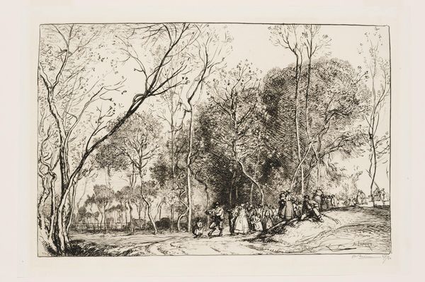 Curator: This ink and etching print by Auguste-Louis Lepère is entitled "Summer of Saint-Martin: The Passing Wedding" and dates to 1908. I'm immediately struck by the overall delicacy. What are your first thoughts? Editor: Delicate, certainly, but also deeply laborious. Look at the sheer density of lines, all etched and carefully applied. It speaks volumes about the craft involved, the repetitive, almost meditative act of mark-making on the plate. Curator: Indeed, the density does add a layer of complexity. Let's consider the composition itself. The procession of figures, likely the wedding party, provides a central motif framed by a very structural arrangement of trees and the receding path. What semiotic meaning can we draw from this? Editor: For me, the trees are essential. The image becomes a commentary on communal celebrations in contrast to the harshness of labor. You've got the festive wedding juxtaposed against this scene, rendered by what would have been, frankly, exhausting physical work. Curator: That's a fascinating tension to point out. I’m intrigued by how Lepère captures light using this technique. Observe the interplay of positive and negative space created by the myriad of lines. It nearly mimics impressionistic brushstrokes despite being a print. Editor: And that choice of subject adds another layer. Why a passing wedding, glimpsed almost by chance? Was this common celebratory culture? This print becomes a historical document by its existence. It captures this particular rural moment, mediated through the labor of printmaking. Curator: So, while you emphasize the conditions of making and the socio-historical record preserved through laborious practice, I am fascinated by how these marks on paper coalesce into such an ephemeral moment, the passing wedding—an impression if you will. Editor: Agreed. The convergence of that labor to reflect daily life provides valuable insight. It's more than an arrangement of formal qualities—it's a visual encoding of human experience embedded within materiality. I leave with a newfound appreciation for the effort behind even seemingly simple etchings. Curator: A final reflection on the aesthetic. Lepère elevates everyday ephemera to a scene worthy of meticulous detail and study, don't you think?