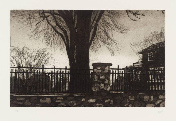 Curator: Peter Doig created this image, titled "Daytime Astronomy". It's part of the Tate collection. Editor: The mood is so nocturnal, though! The limited palette and contrast give it a very moody, dreamlike quality, almost sepia-toned. Curator: It does play with contrasts, and the title is ironic. Consider Doig's interest in depicting environments that evoke memory and place, especially in the context of globalization. Editor: Memory is palpable in the layering and textures. The blurred lines almost make it hard to tell the landscape, but the composition is a little unsettling. Curator: That's true. I'd suggest thinking about the imagery's relationship to contemporary ideas of home and identity. Editor: I see it now, the distortion adds to that feeling of dislocation. A powerful image.