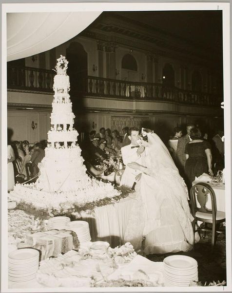 Editor: This photograph, "Untitled (cutting the cake)" by Martin Schweig, captures a wedding moment. The sharp contrast between the white cake and the surrounding darker tones immediately draws my eye. What compositional elements stand out to you? Curator: The photograph's strength lies in its geometry. Consider the receding planes established by the figures and the cake, the way the artist uses light to define form and texture, and the lines converging towards the center, directing our gaze. Do you observe any disruptions of this visual harmony? Editor: Well, perhaps the asymmetry of the figures around the cake? Curator: Precisely. This controlled asymmetry injects a subtle dynamism into what could have been a static scene. The photographer is less interested in the 'wedding' and more interested in form, light, and geometry. Editor: I see it now. It's like Schweig deconstructs the moment into shapes and tones. Curator: Indeed. By attending to these formal elements, we understand the artist's intent beyond the subject matter.