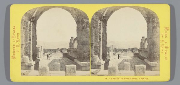 Editor: This albumen print, "Interior of the Colosseum, Rome," was taken by Ernest Lamy sometime between 1861 and 1878. I find the figures almost comically small compared to the immensity of the Colosseum’s ruins. It’s like they’re swallowed by history. What echoes of the past do you perceive here? Curator: It's more than just ruins, isn’t it? The Colosseum resonates deeply because it’s an instantly recognizable symbol. What does its enduring image evoke for you? Editor: I suppose it’s a potent symbol of the Roman Empire – its power, its brutality, its engineering prowess. Curator: Exactly! This arena speaks to the duality of spectacle. It forces us to confront both grand achievement and visceral violence. Notice how Lamy framed the architecture. What visual echoes of that duality do you see within the photographic composition? Editor: The light and shadow, maybe? There’s so much contrast, emphasizing the dark openings against the brighter stonework. Also, the small, solitary figures emphasize the Colosseum’s vast emptiness. Curator: And what might that emptiness represent, do you think? Consider what the arena used to be, versus what it is in this photograph. Editor: Loss, maybe? The passing of time, the decline of an empire… But even in decay, it remains imposing. Its symbolism clearly lingers even after centuries. Curator: Precisely. And this early photograph helps preserve not just an image, but that complex cultural memory too. The print itself becomes a symbol, adding another layer to the story. Editor: I never thought of it that way. It’s fascinating how many layers of meaning a single image can hold, rippling across time.