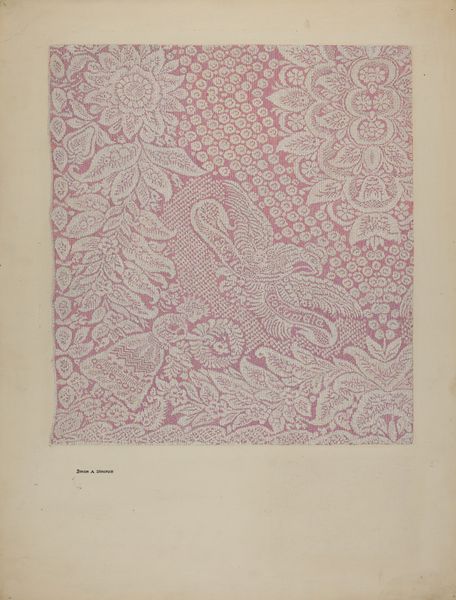 Curator: This is a mixed-media drawing entitled "Ingrain Carpet" dating from around 1936, attributed to Jules Lefevere. It gives us insight into decorative arts of the period. Editor: The textures jump out! It has a depth and handmade quality that contrasts so much with our mass-produced fabrics today. The way the colors interact— the reds and creams—suggest a well-worn, loved object. Curator: It evokes the concept of 'home' but also reveals our shifting definitions of what is tasteful, refined, or even desirable across generations. These floral patterns held quite a bit of cultural capital at one time. What sort of emotions come to the surface when you look at such symbolism? Editor: I see not just floral patterns, but evidence of process. Consider the human effort embodied here: growing flax or cotton, spinning it into thread, carefully weaving the fabric on a loom, then dying it… there are countless hours embedded in this small textile sample. The slight imperfections also speak to handcraft traditions. Curator: True, but I think these flower motifs signify something deeper. Flowers, across many cultures, represent fragility, beauty, fleeting life. Combined in the domestic space they are powerful reminders of life’s cyclical nature – births, deaths, celebrations, and mournings all within the walls of home. This specific flower selection, their density—these all contribute to how someone would interpret their place in society. Editor: I'm less focused on the flowers' metaphorical power and more on their place within the wider ecosystem of production and consumption. It represents not just domestic ideals, but economic forces; from the plantation workers who grew raw materials, to factory laborers who wove the fibers, up to the consumer… It is all connected, literally woven together in the tapestry before us. Curator: It does remind us to value the lineage of everyday objects. How tastes, social status and value judgments leave traces in these objects we live with. Editor: Yes! It grounds the abstract concept of 'home' in the real world. In a world filled with synthetic copies it reminds me of how objects once reflected a connection to place, material and labor.