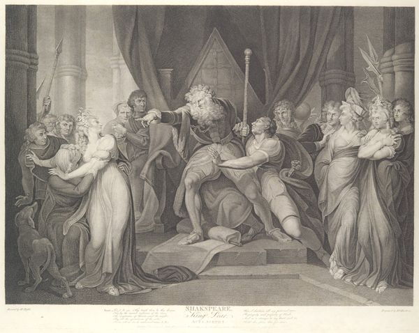 Giuseppe Camerata II created this print, Quadro di Camillo Procaccini, using etching and engraving. The monochromatic composition is dominated by stark contrasts between light and shadow, creating a dramatic, almost theatrical, atmosphere. The figures are tightly arranged, emphasizing the emotional intensity of the scene. The composition is structured around a dynamic interplay of horizontal and vertical lines. We see figures collapsed on the ground, contrasting sharply with those standing, creating a visual tension that draws us into the scene's narrative. The use of light and shadow intensifies the emotional impact, highlighting the suffering and the miraculous. The architectural elements, like the dome in the background, provide a sense of scale and grandeur. Camerata uses the semiotic system of gestures and poses to convey meaning. Each figure's posture, from the collapsed to the upright, tells a story of despair, hope, and divine intervention. Note how the artist uses form to engage with ideas of power and faith. This print challenges us to consider the role of art in representing not just historical events, but also the complex interplay of human emotions.