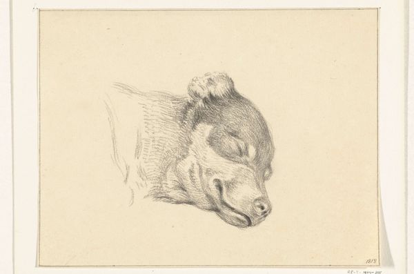 Curator: "Kop van een slapende hond," or "Head of a Sleeping Dog," an etching likely made between 1792 and 1810 by Wouter Johannes van Troostwijk. It's currently held here at the Rijksmuseum. Editor: Immediately, I’m struck by the tenderness of this small piece. It captures such a peaceful, vulnerable moment. The delicate lines convey a sense of quiet intimacy. Curator: It's interesting that you describe it as intimate. Animal portraiture was increasingly popular during this period. With changing social and political landscapes, animals began to function as stand-ins, representing shifting ideals of loyalty and domesticity. Dogs, in particular, symbolized these virtues. Editor: That’s fascinating. So, it's not just a simple depiction of a sleeping dog, but a potential reflection of broader societal values? Were certain breeds favored to reinforce specific ideals? Curator: Absolutely. Specific breeds carried particular connotations tied to status or social standing. While it’s hard to pinpoint the exact breed in this etching, the dog's comfortable sleep could be seen as representative of bourgeois comfort and stability, especially against the backdrop of revolutionary turmoil. Editor: That contextual layer changes my understanding. The etching style, quite realistic, gives the sense of seeing an actual animal; combined with those cultural markers, one is now asked to consider one's position as a privileged, and safe viewer. Curator: Exactly. Moreover, the distribution of such prints played a crucial role in disseminating these values amongst the broader public. Think of this etching not just as art, but as a piece of visual culture that actively participated in shaping contemporary society. Editor: So, an ostensibly innocuous image could actually be interpreted as a reflection of dominant social norms, perhaps even an endorsement of a particular way of life. Food for thought indeed. Curator: Precisely! And perhaps prompts us to question what seemingly simple animal images convey today. Editor: Yes, definitely complicates how we look and assign significance. This small piece has sparked more discussion than I'd initially expected. Thank you.