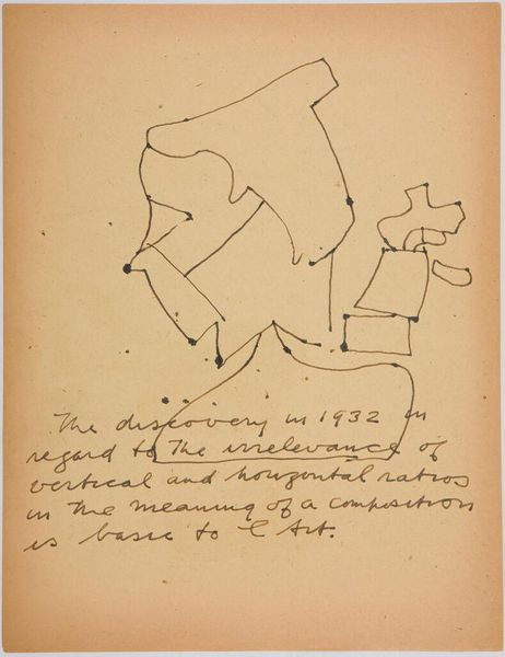 Editor: This is Stuart Davis’s "Art Theory Text with Sketch" from 1942. It's a busy page, filled with handwriting and a geometric sketch. It feels like we're looking at the artist's raw, unfiltered thoughts. What do you make of it? Curator: It's like a glimpse into Davis's artistic laboratory. See how he's grappling with turning abstract ideas into concrete forms? The text and sketch are symbiotic, one feeding the other in a constant dance of thought and creation. I wonder if he was thinking about jazz when he wrote this; that's where the "daring to surmount" comes from, perhaps. What do you think? Editor: That’s interesting! So it's less about the finished product and more about the process of thinking about art? Curator: Precisely! It’s the beautiful mess of trying to make sense of the world through art.