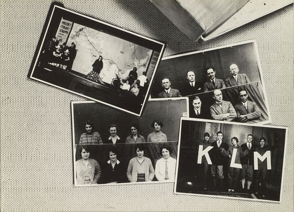 This is a page from a photo album, featuring images of Isabel Wachenheimer and her colleagues at KLM in Israel, taken by an anonymous photographer around 1954. The monochromatic palette gives the images a timeless feel. It's as if the photographer was trying to capture not just a moment, but the essence of a place and time. I'm really drawn to the texture of the photograph itself. It’s not pristine or overly polished. The edges are rough, suggesting a hands-on process of printing and developing, reminding us of the physical act of making art. Look at the way the light catches the surface and casts soft shadows. It creates a depth that makes me feel like I could reach out and touch the people in the photos. The composition is simple, yet the arrangement of the photos on the album page suggests a narrative, like a storyboard for a film. It reminds me a little of some of the work of Gerhard Richter, in the way that everyday snapshots can be transformed into something more profound. Ultimately, this photo album page shows us how art can be found in the most unexpected places, inviting us to see the beauty in the ordinary and the extraordinary in the everyday.