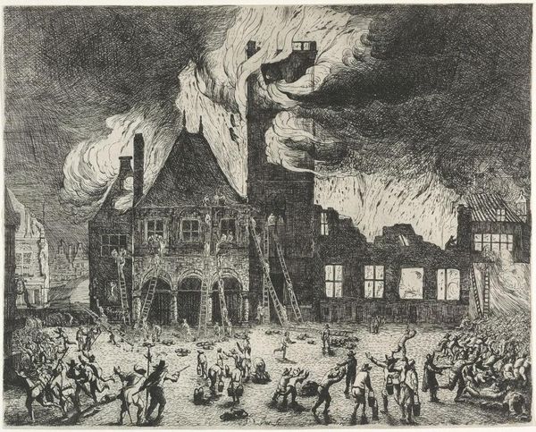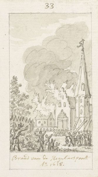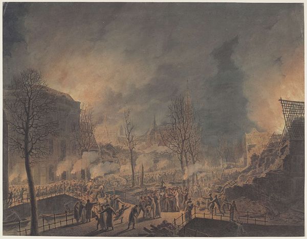 Editor: We’re looking at Gerrit Lamberts' watercolor, "Burning of the Customs Houses at the Nieuwe Brug in Amsterdam," from 1813. There’s a real sense of chaotic energy. The architecture feels imposing, while in the center of the image, there’s a dynamic explosion. How would you interpret the story this piece is telling? Curator: This work, beyond its aesthetic qualities, offers a potent commentary on a specific historical moment and the public’s reaction to socio-political realities. Amsterdam in 1813 was a city chafing under French rule. What do you notice about the crowd in relation to the burning buildings? Editor: They seem… almost celebratory? There’s definitely no sense of panic that you’d expect with a fire. Curator: Precisely. The burning of the customs houses, symbols of French authority, becomes a public spectacle, an act of defiance. Lamberts is not simply recording an event; he’s documenting a collective sentiment. Notice how the architectural drawing, despite the event, takes prominence. Editor: I see it. The buildings around the burning customs houses are permanent, stable, representing Dutch identity. The fire is fleeting, a temporary disruption by a foreign power. Curator: Exactly! Lamberts’ choice of watercolor also contributes. Its relative ephemerality underscores the transient nature of political power, especially when compared to the enduring cultural landscape. How do you feel the museum space influences our interpretation? Editor: I suppose being displayed here gives this historical event a certain weight and permanence, making it a part of our shared cultural memory. I see now, it's more than just a depiction of a fire. It’s about public sentiment and power structures. Curator: Precisely! And seeing it now helps us reflect on the ongoing interplay between art, politics, and public perception.