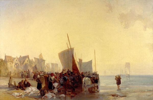 Curator: Seeing it here in person really highlights the immense labor depicted. I'm struck by the weight of it, the sheer physicality rendered so viscerally by Repin. Editor: Indeed. And let's not forget what this canvas is depicting—Ilya Repin’s “Barge Haulers on the Volga," captures the arduous lives of these men, essentially human pack animals, condemned to a life of unremitting physical labor pulling barges along the riverbank. Curator: The visible brushstrokes emphasize the texture of their clothing and the rough terrain, really forcing you to acknowledge the conditions of the labor, which speaks volumes about artistic labor as well. Oil paint applied with clear effort in replicating this subject… the sheer amount of oil on this canvas! Editor: Exactly. We see this as both an indictment of social inequality and the conditions in Tsarist Russia at the time, and frankly as something far larger that can still be related to current class struggles across our global society. Notice how their varied expressions speak to distinct characters trapped within a system. Some seem resigned, others defiant. Curator: What's so impressive is how Repin draws attention to the material culture surrounding their labor: their worn clothing, the thick ropes, the texture of the sandy bank. These weren't posed subjects, were they? Repin really embedded himself to understanding these grueling conditions. Editor: Precisely, to emphasize my point, Repin clearly uses Social Realism to convey both truthfulness, and even documentative sensitivity that serves an advocacy purpose. Look how it serves as a damning visual argument against exploitation, using human subjects but also emphasizing their individual dignity amidst collective oppression. Curator: I agree, this kind of painting makes me think about art’s ability to influence socio-economic systems. Repin wanted the viewers to understand and recognize the importance of the making, whether in human labor or the application of his artistic production. Editor: This truly leaves an impact beyond the canvas. Art as historical commentary, art as an appeal for humanity—a perspective on an artwork, such as "Barge Haulers on the Volga" that can still resonate today. Curator: Well said. Now, if we turn our attention to our left…