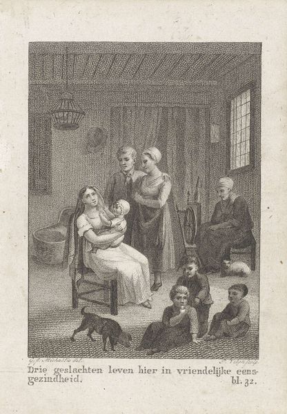 Editor: This is "Knight with a Seated Lady," an 1837 engraving by Johannes de Mare. It gives me a sense of subdued drama, everyone seems so tense! How do you interpret this work? Curator: I see a potent depiction of power dynamics through the language of objects and posture. Notice the knight in full armor: armor doesn’t only signal strength but protection and inaccessibility. He’s heavily shielded. Why do you think he needs protection? Editor: Perhaps because the lady looks as though she’s arguing, or in distress? Is the armor also a status symbol? Curator: Absolutely. Consider also how the men behind the knight observe, and even the architectural arch above reinforces this framing and containment. Do you think the space serves to elevate the scene, or imprison her? The cultural memory associated with knights, particularly in the romantic era, would associate the knight as a rescuer or protector of the lady, however, based on what we see in her face, and the tension of the composition as a whole, it feels more ominous. Editor: That’s a good point. I didn't consider the way the architecture might reinforce a sense of confinement. Is she imprisoned by the social expectations of her time, too? Curator: Precisely. Engravings like this became ways to depict stories but also cultural values; who has agency and who does not. They also allow these stories to be disseminated widely. This image asks us to confront whose story is truly being told and for what purposes. Editor: I hadn't thought about it that way. It’s interesting to consider the cultural impact an image like this might have had! Curator: Indeed. It really prompts us to think about the layers of meaning embedded in historical depictions, and how symbols shift and speak across time.