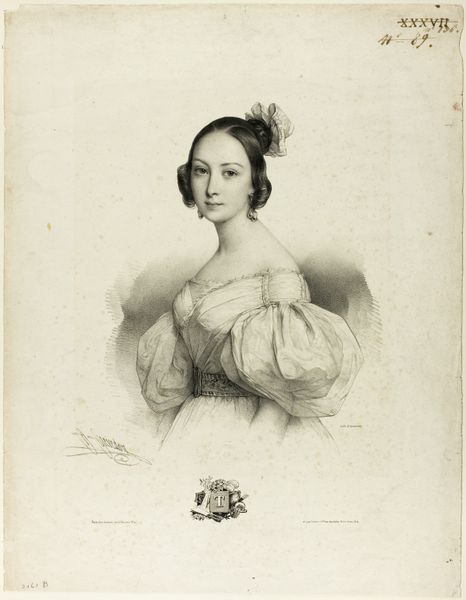 Curator: Look at this delicate lithograph of Mlle. Amigo by Achille Devéria. There's a softness to it, isn’t there? Almost dreamlike. Editor: Yes, but observe the lithographic process – the labor involved. See how Devéria uses the grease crayon on the stone to achieve those subtle gradations? Curator: It's as if he's captured her very essence. The slightly wistful gaze, the elegant drape of her gown...it whispers of unspoken stories. Editor: Unspoken, perhaps, but consider the context. These prints were commodities. Reproductions made for consumption, democratizing art, and perpetuating ideals of beauty for the bourgeoise. Curator: Ah, but beauty nonetheless. And perhaps that beauty, spread wide, is a kind of revolution in itself? Editor: Maybe. At least now I know exactly how this was made. Curator: A lovely sentiment to hold onto.
