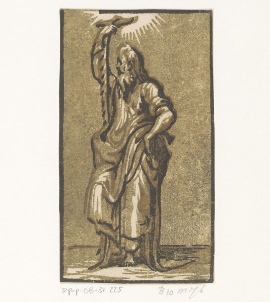 Curator: Oh, this piece gives me such a quiet feeling. A little haunting, but definitely serene. Editor: Well, it depicts Saint John the Evangelist, believed to be made sometime between 1520 and 1550. It's attributed to Antonio da Trento, and created using an intaglio engraving technique. Curator: An intaglio engraving... I see it in those deeply etched lines. And the way the light halos him! There’s such a drama happening with this divine glow over such subtle movements. A dance of reverence perhaps, especially in consideration to that small animal. Editor: Yes, he’s often depicted with an eagle, which symbolizes the lofty heights of his gospel. It places him firmly within Renaissance humanism and its visual language around spirituality and knowledge. Though, looking at how diminutive he is in relation to it, it is reminiscent of more docile features. He may appear like any normal man finding comfort with a puppy. Curator: Absolutely. And it's interesting to think about how accessibly relatable this might've been to people back then. To show such divinity with the gentle vulnerability is a pretty bold move! To invite faith instead of dictating it. But I also feel its fragility, being on paper... easily damaged, erased even. What histories may never reach us, or become altered to fit a certain vision. Editor: Precisely, because while the work reflects humanism’s focus on individual potential, it's impossible to separate it from the political power and socio-cultural constraints. These works often served as propaganda, especially considering their prevalence within the dominant societal values and religion during that period. Curator: A point well taken. The power in the delicate dance between propaganda, vulnerability and faith; isn't it something to witness? And such is the magic of witnessing such a seemingly quaint work, isn’t it? I walk away filled to the brim with a need for deeper conversations. Editor: Exactly! To be conscious about where such power resides, who holds them, and why must we always question its source. Thanks to engravings such as this one, we continue those critical dialogues, and that alone grants it incredible historical significance.