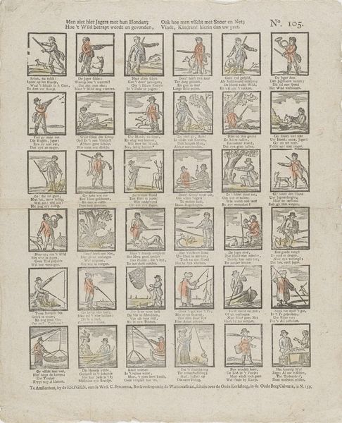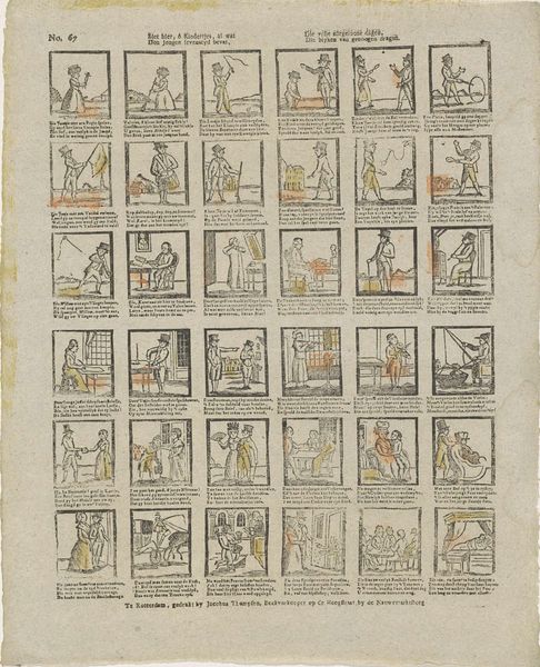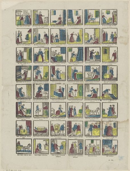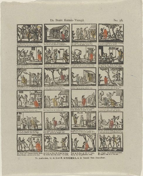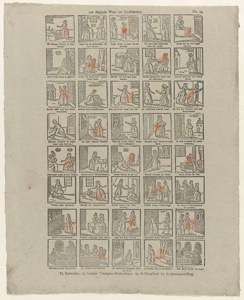 This print, "De nieuwmodische Amsterdamsche dienst-meisjes," was made by Erve H. Rynders in Amsterdam, though the date remains unknown. It presents a series of vignettes depicting the lives, or rather, misadventures, of modern Amsterdam maids. The image creates meaning through its sequential format, akin to a comic strip, offering a satirical commentary on the changing roles and behaviours of domestic servants. In a time when social hierarchies were deeply entrenched, this artwork subtly critiques the disruption of traditional norms. The scenes, though humorous, reflect anxieties about social mobility and the blurring of class boundaries within Dutch society. Understanding this artwork requires delving into the social history of the Netherlands, examining the economic shifts that allowed for such “modern” behaviours. Archival records of household management and conduct manuals would provide further insight into the norms this print playfully subverts. By considering the artwork within its specific social and institutional context, we can better appreciate its subtle yet potent commentary on the evolving dynamics of class and labour.