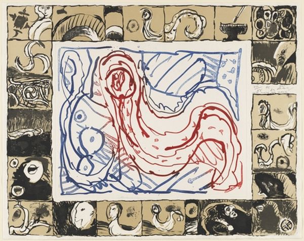 Editor: Here we have Joan Miró's "Double page plate," created in 1966 using acrylic paint. It strikes me as quite playful, almost childlike, with its vibrant colors and seemingly random placement of shapes. How do you interpret this work? Curator: Miró, even with his playful aesthetic, was deeply engaged with the socio-political landscape of his time. This piece, created during a period of immense social upheaval, invites us to consider the ways in which artists respond to and, at times, subvert the established order. The biomorphic shapes and surreal composition, in their seeming innocence, hint at a deeper questioning of reality. How do you see the tension between the playful surface and potentially critical subtext? Editor: I hadn’t considered that tension explicitly. I was focused on the geometric forms. Maybe the playfulness is a way of making those deeper questions more accessible, less confrontational? Curator: Precisely! And consider Miró’s context: Spain under Franco. Direct protest was silenced. Surrealism, with its roots in the subconscious and the irrational, became a powerful language for critique. Do the colours—the primary red, yellow, and blue—strike you as intentional in any way, perhaps even symbolic? Editor: It's interesting you mention the political backdrop. Perhaps the colors represent a desire for a simpler, more ideal world, a rebellion against the greyness of oppression? I hadn't thought about it that way before. Curator: Exactly. The intersection of the personal and the political is where Miró’s genius resides. By using the language of dreams and symbols, he critiques the world around him while inviting the viewer to participate in this act of resistance. Editor: That gives me a whole new appreciation for Miró. It’s not just whimsical; it’s subversive! Curator: Indeed. Art often operates on multiple levels, and understanding the context is crucial for unlocking its full potential. Editor: Thanks, I'll never look at Miró the same way. I see much more now.