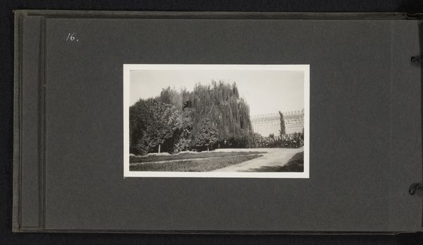 Curator: This is a photograph titled "Waterreservoir in de tuinen van Aguedal, Marrakech" by A.G.A. van Eelde, likely taken around 1927. It falls within the Pictorialism style. Editor: My first impression is one of stillness. The water is like glass, and the monochrome palette gives it a timeless quality, almost dreamlike. It is very calm. Curator: Exactly. Pictorialism, especially at that time, aimed to elevate photography to the status of fine art through carefully controlled techniques and printing processes. Think soft focus, painterly effects. The artistic intent becomes paramount. Editor: Which immediately raises the question: what labor went into producing this specific print? Was it Van Eelde themselves? Which tools or techniques were most important to achieving that effect? The image's content directs us away from Marrakech and the reservoir, towards the physical making, production, and manipulation in the darkroom. Curator: Yes, and considering Van Eelde’s body of work, the landscape subject matter also connects this work to the larger European tradition of landscape painting and photography, and their aestheticizing impulse. Editor: Thinking about its public reception in the 1920s, a Western audience might have viewed this through a colonial lens, romanticizing a North African scene, which removes the photo further from daily life in Marrakech and places it closer to other pictorial landscapes. Curator: Certainly. The very act of photographing these gardens implies a specific power dynamic. But thinking about the materiality of water, especially in such a dry climate, makes the image much more complex. A reservoir like this one served as a vital source of water, infrastructure that served the city itself. It challenges our simplistic view of gardens, in general. Editor: Yes, I can almost hear the water… that smooth surface betrays nothing. Curator: It is a photo that makes you wonder about both the visible and the unseen forces shaping the scene before us.