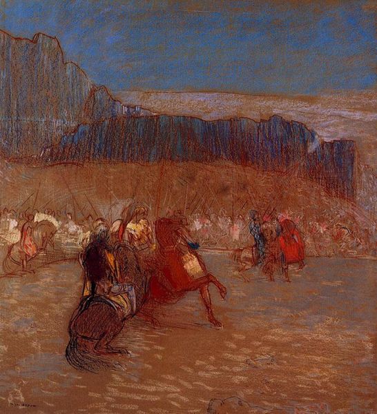Editor: This is "Gathering of Elegant Women" by Adolphe Monticelli, an oil painting with visible impasto. It feels dreamlike and theatrical. What draws your eye when you look at this piece? Curator: The arrangement of the women in a sort of tiered pyramid, almost as if they are posed on a stage, calls to mind classical depictions of nymphs or Muses, but set adrift in a less formal, more emotionally resonant landscape. Note how their light gowns almost glow against the darker backdrop. Editor: I see that too. There’s a strong contrast between light and dark. Curator: Exactly. Monticelli frequently uses this contrast to evoke a sense of mystery, a world half-seen, half-imagined. It lends an otherworldly air, doesn’t it? But what are these women *doing*? Are they merely idling, or enacting some secret rite? This ambiguity speaks to the symbolist leanings of the period, an effort to represent something deeper. Editor: So you're suggesting these women aren’t just portraits but symbolic figures? Curator: Precisely. Think of it as a visual poem. Each figure, each carefully placed object or detail in the background carries a resonance, layering meaning to create a cultural echo chamber, where classical, theatrical, and natural symbols comingle. Editor: I’ve never considered landscape quite that way, a space for layered cultural symbols. Curator: Indeed. Monticelli creates his own personal visual language, built on a cultural lexicon that continues to resonate even today. The very act of gathering becomes a symbol. Editor: It’s like he's tapping into something ancient. It definitely provides more to think about!