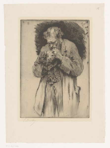 Editor: So, this etching is titled "Kaalhoofdige man met een glas in de hand," or "Bald-headed man with a glass in his hand," created in 1887 by Leo Van Aken. I find the texture really interesting - there’s almost a gritty feel to the whole composition. How do you interpret this work from a formal perspective? Curator: The power of this print resides within the skillful deployment of line and texture. Observe how Van Aken uses the density and direction of etched lines to model form and create depth. Where do you see this particularly evident? Editor: Definitely in the rendering of his face, particularly around the eyes and cheekbones; the concentration of lines seems to carve out the planes, really giving him dimension. Curator: Precisely. The contrast between the densely worked areas and the lighter spaces establishes a dynamic visual rhythm. Semiotically, consider the chair upon which he rests. What visual impact does it make, in its supporting role? Editor: It provides structure and a grounding element that juxtaposes his reflective posture. What do you make of the figure's gaze and gesture - his index finger pointed skyward? Curator: The upward gesture, combined with his contemplative expression, introduces a layer of complexity. Consider the formal qualities of the glass he holds, its simple geometry a counterpoint to the organic forms of the figure. How might we understand the relationship between these forms in terms of visual language? Editor: The man's more textured and realistic features contrasts with the clean simplicity of the glass, suggesting maybe a balance or tension between reality and something more refined? Curator: An astute observation. Indeed, this work encapsulates a fascinating dialogue between form and content, demanding a close visual reading to unlock its layers of meaning. Editor: Thank you - examining Van Aken’s choices in line and composition really opens up a whole new perspective!