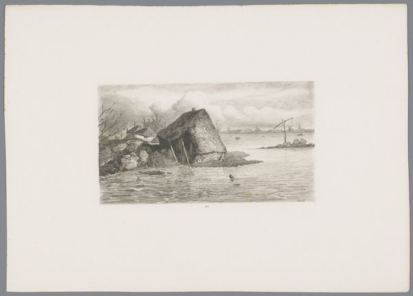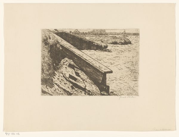 Curator: Frank Short's "A Span of Old Battersea Bridge," created in 1899, offers a glimpse into late 19th-century London. It’s rendered with both etching and aquatint techniques. Editor: My first impression is of stark contrast – a shadowy, almost cavernous structure framing a delicate, muted waterscape. There's a sense of looking both *through* and *into* the image. Curator: Indeed, the artist's deliberate composition constructs a narrative of old versus new, the natural world against industrial encroachment. The framing structure pulls your focus immediately, before revealing the wider context. The tonality alone does wonders. Editor: Considering its medium—etching and aquatint—I’m interested in the labor involved in its production. The careful biting of the metal plates, the layering of tones... It’s a surprisingly material-heavy process to achieve such a seemingly fleeting, impressionistic effect. And there's that beautiful degradation, a deliberate display of wear that mirrors the age of the bridge. Curator: The architectural elements almost create a proscenium. It gives that theatrical lens effect you mention. If you notice how the light hits specific elements, such as the water or those timbers in the foreground, it’s clear Short is deeply concerned with the picturesque potential of this area of London. Editor: And it raises questions, doesn't it, about accessibility and labor? The figures in that small boat suggest a working presence on the river, a reality for many Londoners at that time. We see industry looming in the background, hinting at the changing socio-economic tides and the daily existence of the community using that waterway. Curator: It does force a reconciliation, or at least a close proximity, between visual aesthetic appreciation and social reality. Even as we admire Short’s technical skill and careful staging of the composition, we have to confront what lies beyond the surface. Editor: Precisely, Short's work transcends mere landscape portrayal by imbuing the urban setting with a sense of working existence, of daily craft navigating monumental yet deteriorating structures. Curator: A fascinating blend of technical prowess, historical observation, and compositional design. Editor: Yes, it also highlights the human element inherently embedded in these structures. The decaying grandeur of industry echoes with the voices of past generations who shaped it, both literally and metaphorically.