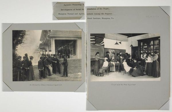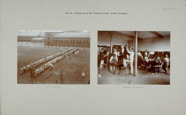 Curator: Let’s turn our attention to Waldemar Titzenthaler’s “War: Germany. Berlin. Prussian Guard Regiment: Life in a Regiment of the Prussian Guard.” Editor: It's heavy, isn't it? That sepia tone just oozes history... makes you think about all those young men, frozen in time, somewhere between drudgery and discipline. Curator: Indeed. Note the diptych format; Titzenthaler segments labor and instruction. The left panel, with its horizontal lines of laboring soldiers, contrasts sharply with the right, where vertical columns frame a seated assembly. Editor: It’s almost theatrical, the way the officer holds court. The whole scene has this airless, staged quality that both fascinates and disturbs me. Makes you wonder what stories those eyes could tell. Curator: The composition invites us to consider the Prussian military machine. Editor: A rigid structure but also a deeply human story, don't you think? Thanks for pulling back the curtain.