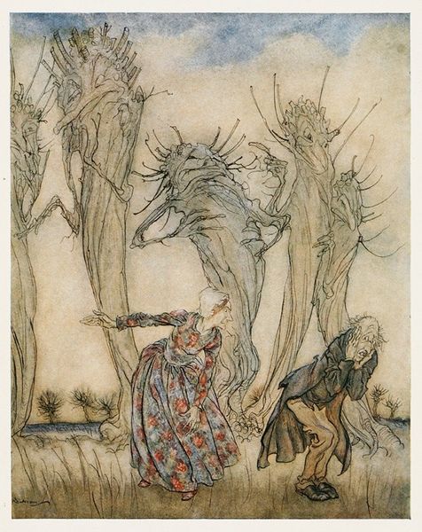 Arthur Rackham made this illustration, "The Fir-tree and the Bramble," using ink and watercolor. It's so linear! The line creates the form, and you can feel him working to build up the tone with these tiny strokes. I like that it’s not overworked, it's confident. He really lets the white paper do some of the work. The color palette is moody, with mostly grays and browns, but there are also some lovely deep reds in the brambles. It reminds me of my own process, where the underpainting peeks through, adding depth and complexity. The fir tree itself is really striking. It's almost human, with its gnarled branches and expressive face. And the way Rackham uses the ink to create texture is just masterful. If you look closely, you can see how he layers the strokes to build up the form and create a sense of depth. It reminds me a bit of Kay Nielsen's work, that graphic illustrative style, but with a unique kind of theatricality. It’s a good reminder that art is always in conversation with itself, across generations and styles.